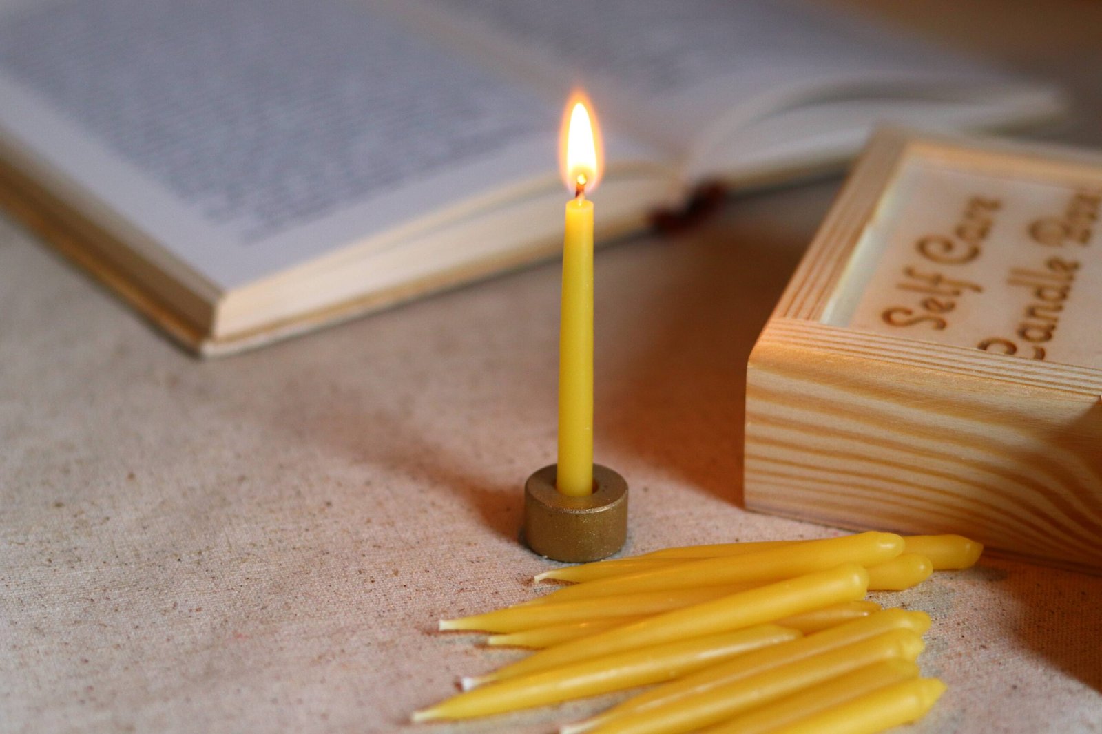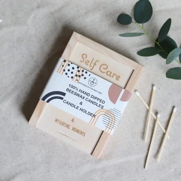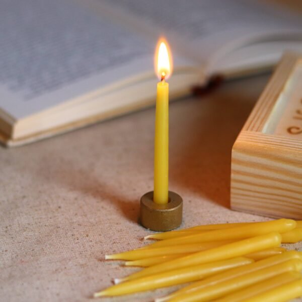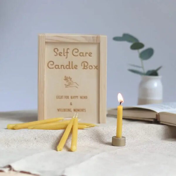20-minute candles set with brass candleholder in wooded gift box. Each box is presented in colour paper sleeve. Box contains brass candle holder with 20 hand dipped raw beeswax candles in earthy colours.Each candle burns approx. 20-25 minutes. Size of each candle is approx 7cm tall and 6mm wide. Perfect for your daily meditation. yoga. reading or mindfulness practices.Candles are non dripping and made of raw beeswax.Size of box ?C 13cm x 10cm x 3cmChoose between full set (box + stand + candles) or refill candles only (no box or stand. just candles)Beeswax:Beeswax is of highest purity. It comes from our apiaries and can be either from cappings (lighter colour) or bees brood box (darker colour). Material: Beeswax. real wood. cotton & brass