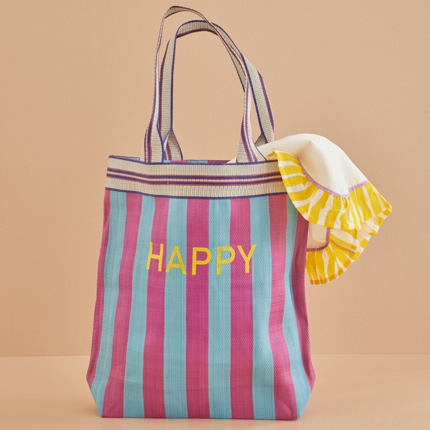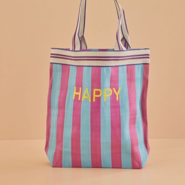 Recycled Plastic “Happy” Shopping Bag with Blue and Purple Stripes